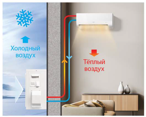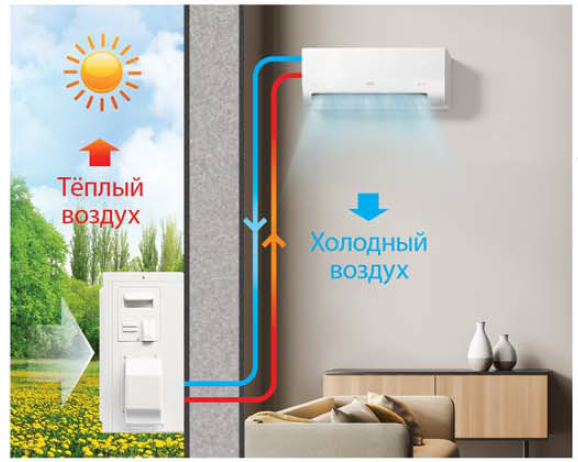 Тепловой насос воздух-воздух представляет собой DC-инверторную сплит-систему, со-стоящую из внутреннего блока (испарителя) и наружного блока (конденсатора).