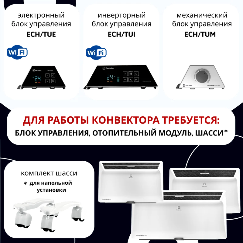 Конвектор Transformer System состоит из отопительного модуля (базовая часть) и съемного блока управления. Интеллектуальный блок управления Transformer Electronic с полноцветным TFT-дисплеем хранит в памяти персональные температурные настройки пользователей. 3 режима работы, 24-часовой таймер, функция блокировки кнопок "родительский контроль".